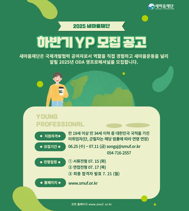 | 제목 | [채용] 2025 새마을재단 하반기 YP 모집 | 등록일 | 2025-06-27 | 조회수 | 775 | ||