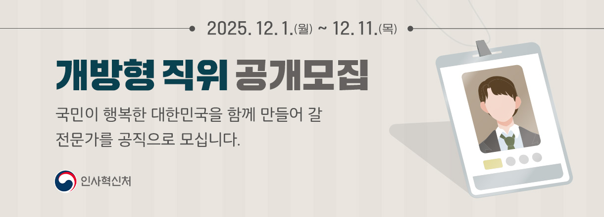 2025.12.1.(월)부터 14개의 개방형 직위에 대한 모집공고가 진행되고 있습니다. 동 공모와 관련하여 공직 내·외부의 전문성과 경험을 가진 다양한 전문가들의 많은 관심 바랍니다.