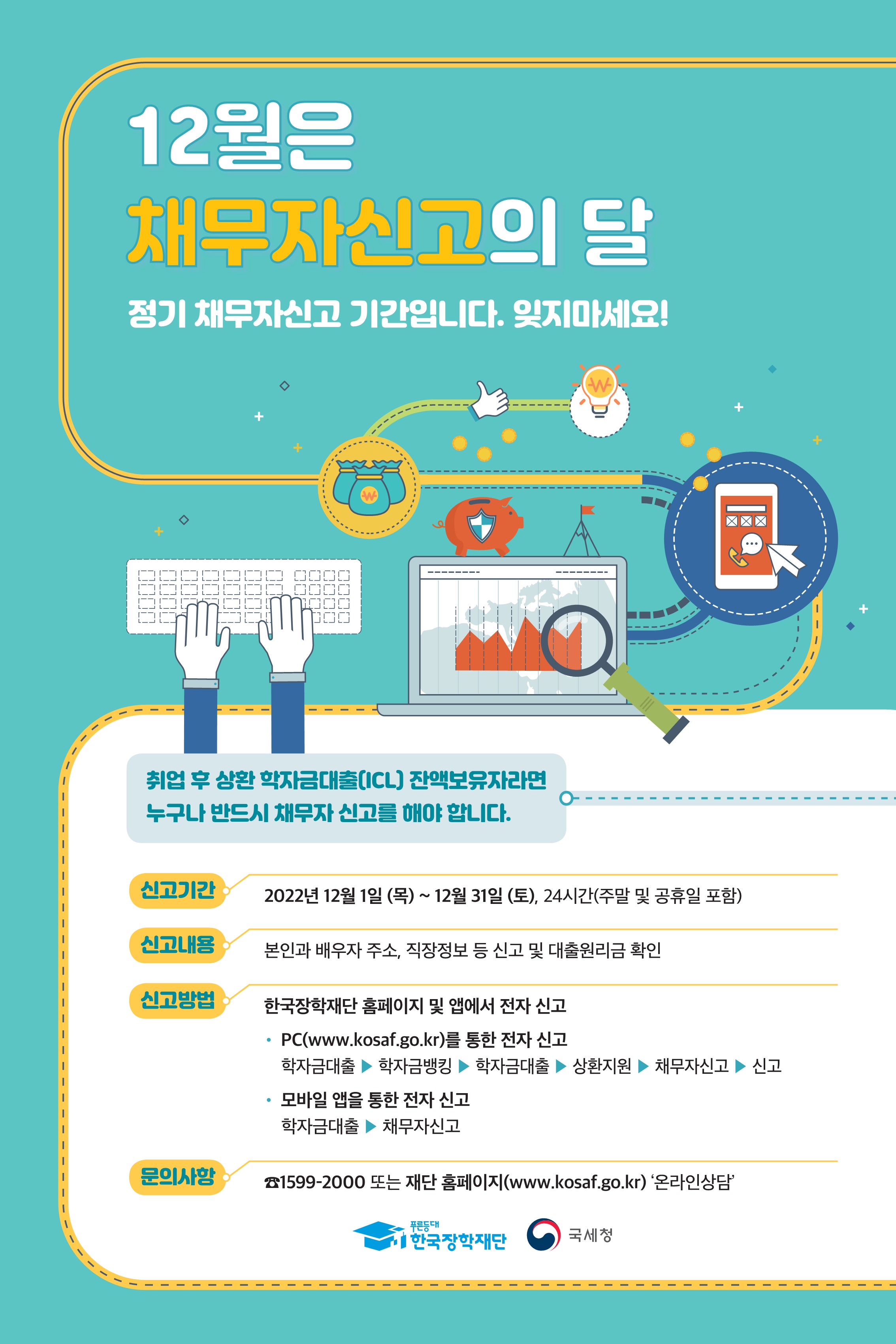 한국장학재단에서 취업 후 상환 학자금대출 잔액보유자는「취업 후 학자금 상환 특별법」제15조, 제20조, 제21조에 따라 ‘채무자 신고’(연 1회) 및 ‘해외이주·유학 신고’ 의무가 있습니다. 아래의 포스터와 첨부파일을 참고해 주시길 바랍니다.