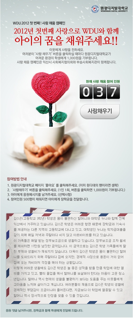 원광디지털대학교(www.wdu.ac.kr)는 2012년 신년을 맞아 페이스북을 통한 특별한 기부 이벤트를 진행한다고 18일 밝혔다. 이번 이벤트는 원광디지털대의 페이스북(www.facebook.com/wduuniv)에서 진행되며 '사랑채우기' 버튼을 누르면 1천원씩 카운트돼 나눔에 동참할 수 있다. 참여인원은 500명까지이며 모든 인원이 모이면 전라북도 익산시 부송 사회복지관에서 관리하는 기초생활수급자 가정의 고등학생에게 장학금 50만원이 전달된다. 이벤트 참여는 1인1회로 제한됐지만, 참여는 누구나 가능하다.