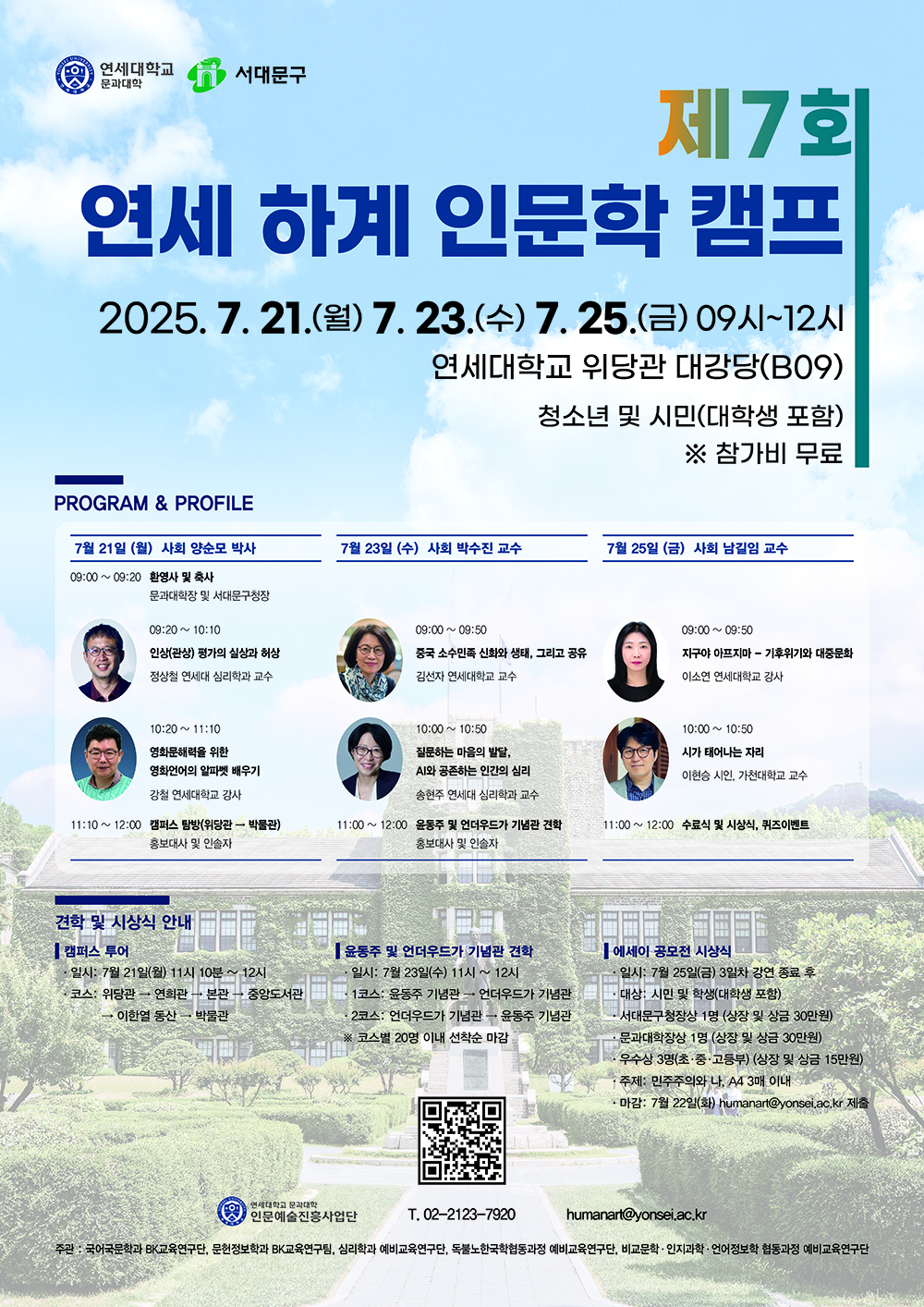 | 제목 | [학생참여] 제7회 하계 연세 인문학 캠프 | ||||
