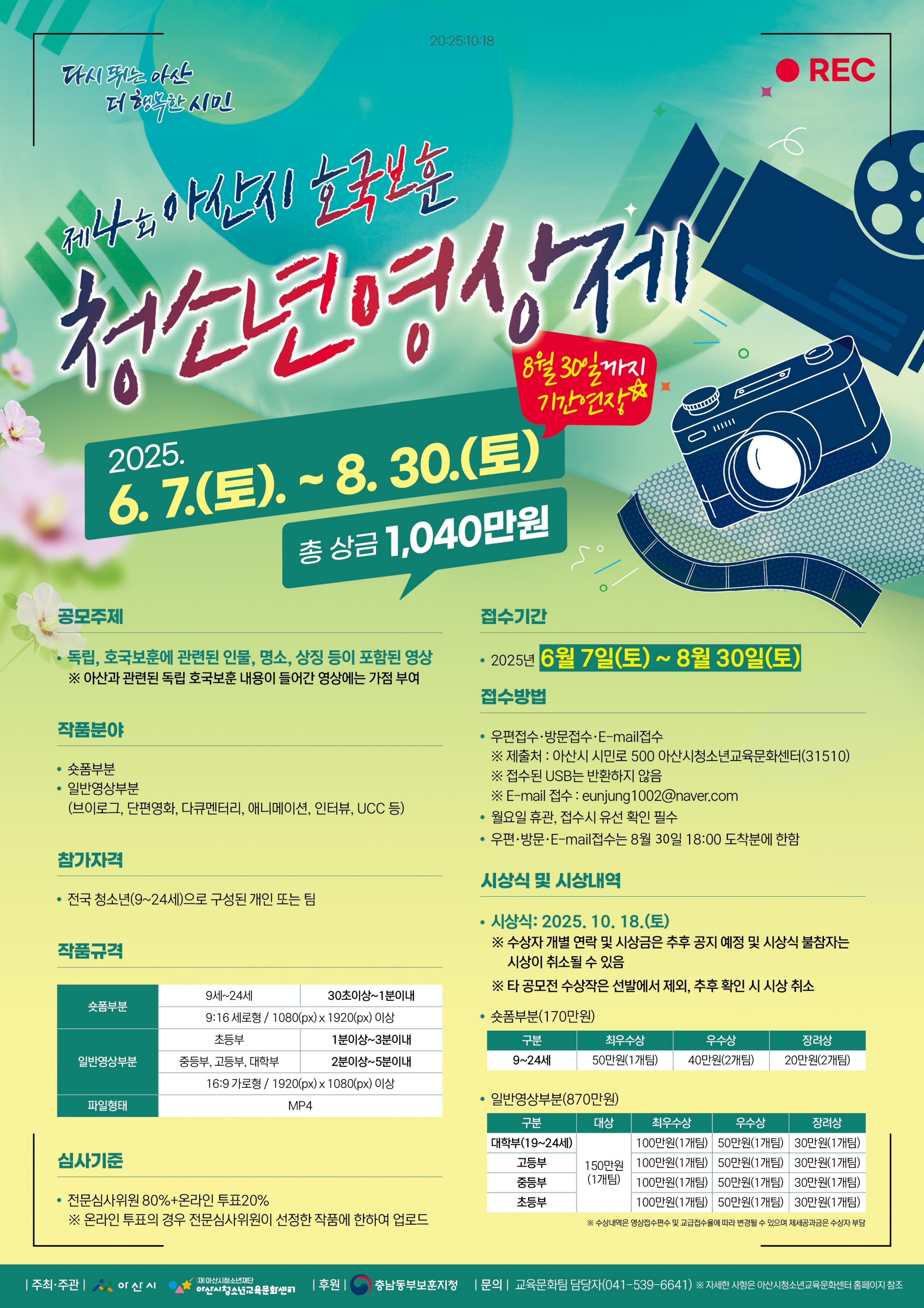 | 제목 | [공모전] 2025년 제4회 아산시 전국 호국보훈 청소년영상제 공모전 개최 안내 | ||||