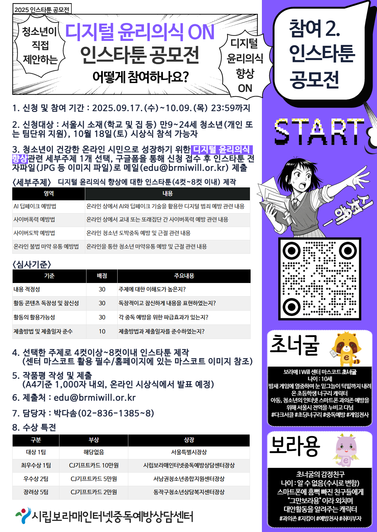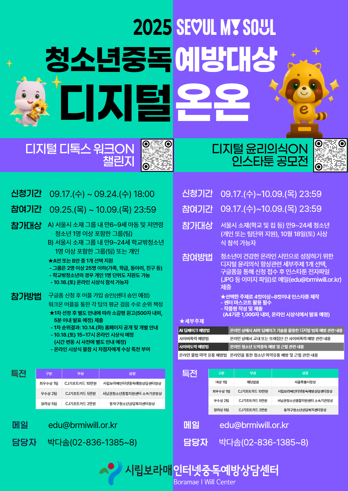 | 제목 | [공모전] 2025년 서울특별시장배 제4회 청소년디지털미디어중독예방 「워크온 걷기 챌린지 및 인스타툰 창작 공모전」 | ||||