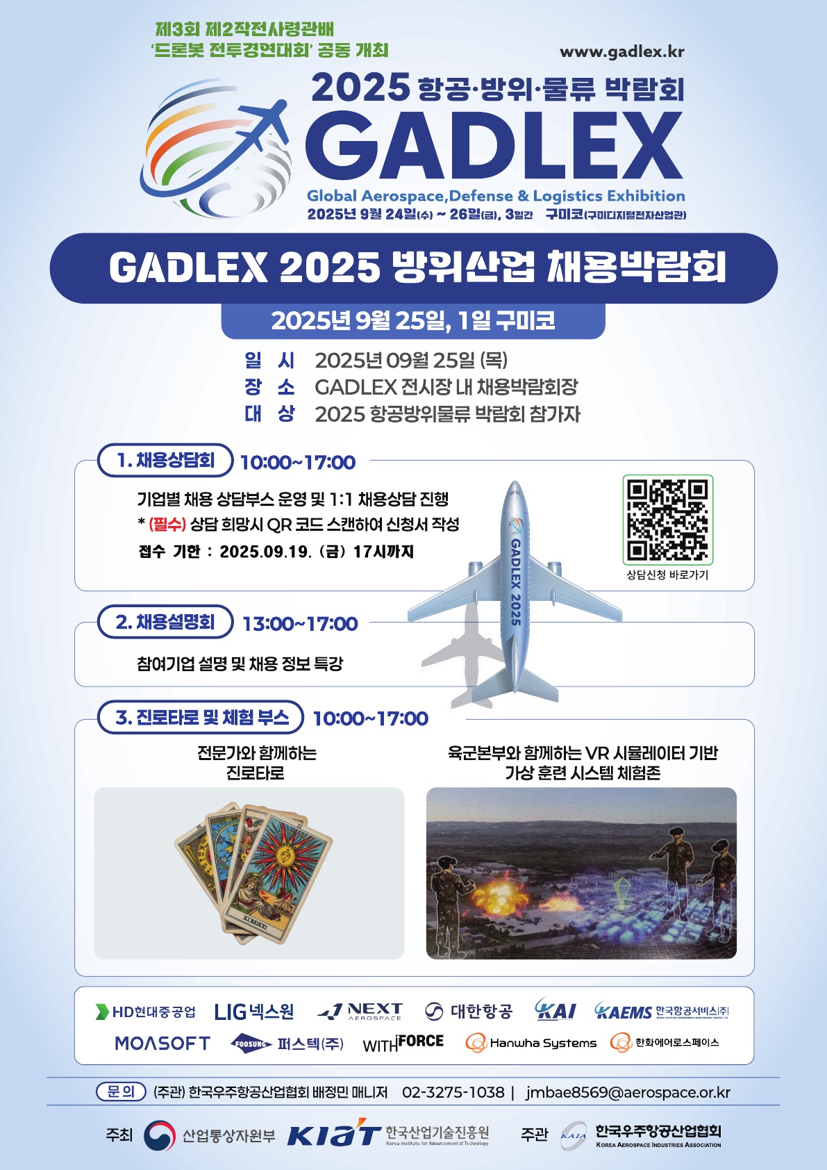 최경북도는 9. 24.(수) ~ 9. 26.(금), 3일간 구미코에서 「2025 항공방위물류박람회」를 개최합니다. 특히, 청년들에게 양질의 일자리를 제공코자 기업체 채용설명회 및 1:1 채용 상담부스도 아래와 같이 운영하오니, 많은 참여 바랍니다.