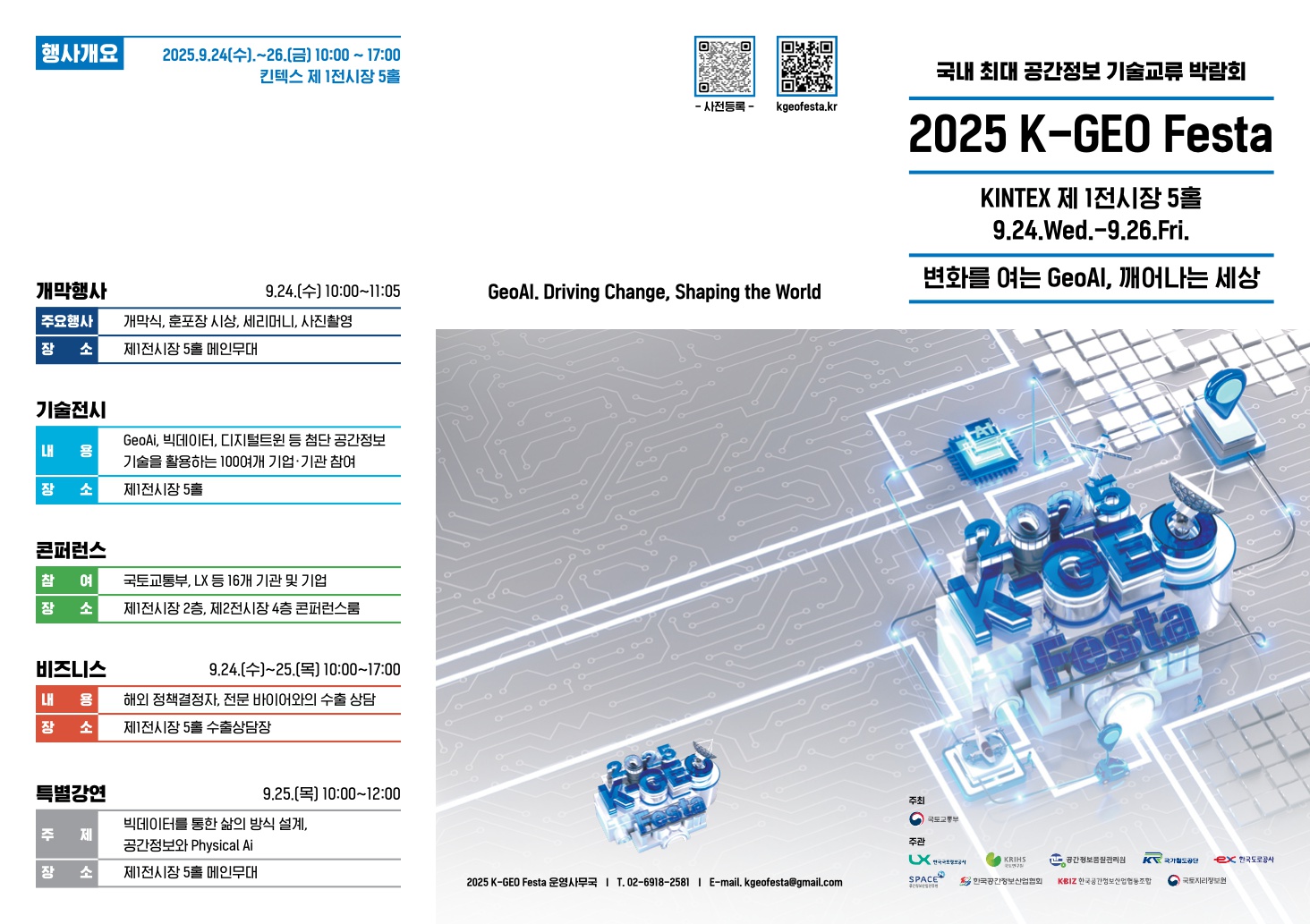 국내 최대 규모의 공간정보 기술교류 박람회로서 17회째를 맞이한 「2025 K-GEO Festa」를 아래와 같이 개최하오니, 많은 참여 바랍니다.