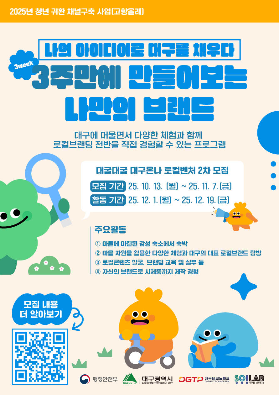 대구광역시와 대구테크노파크협동조합 소이랩에서는 타지역 청년을 대상으로 대구에 머물면서 대구만의 고유한 특성과 차별화된 로컬브랜드 개발 실무 경험을 제공하기 위해 『청년 귀환 채널구축 사업(고향올래)』 로컬벤처 창업 프로그램을 시행합니다. 많은 관심과 참여 바랍니다.