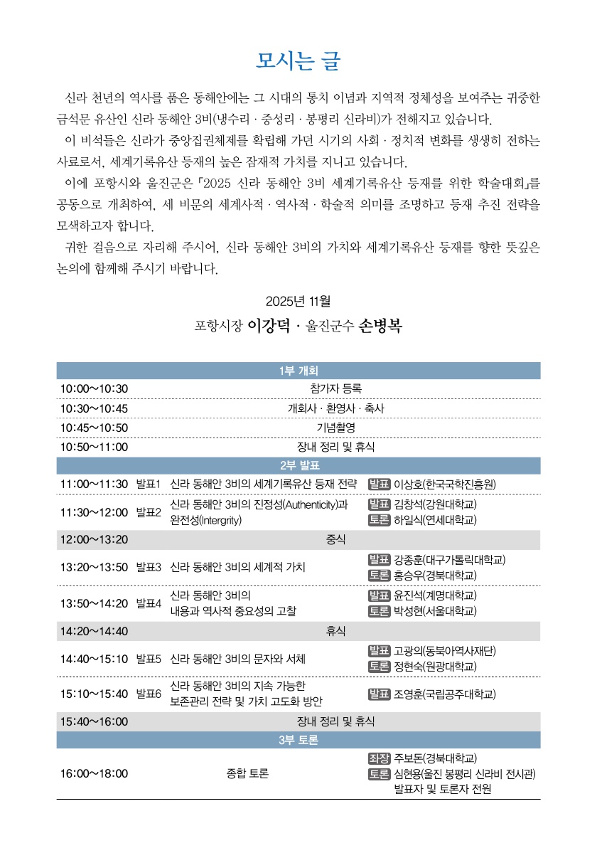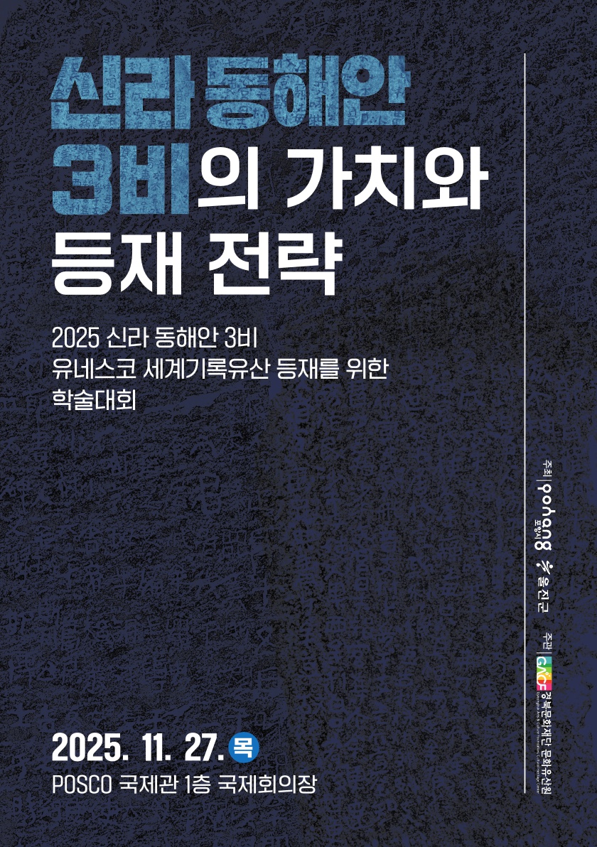포항시·울진군이 주최하고 경북문화재단 문화유산원 주관하는 『2025년 신라 동해안 3비의 유네스코 세계기록유산 등재 추진』을 위한 학술대회를 아래와 같이 개최하오니 많은 참여를 부탁드립니다.