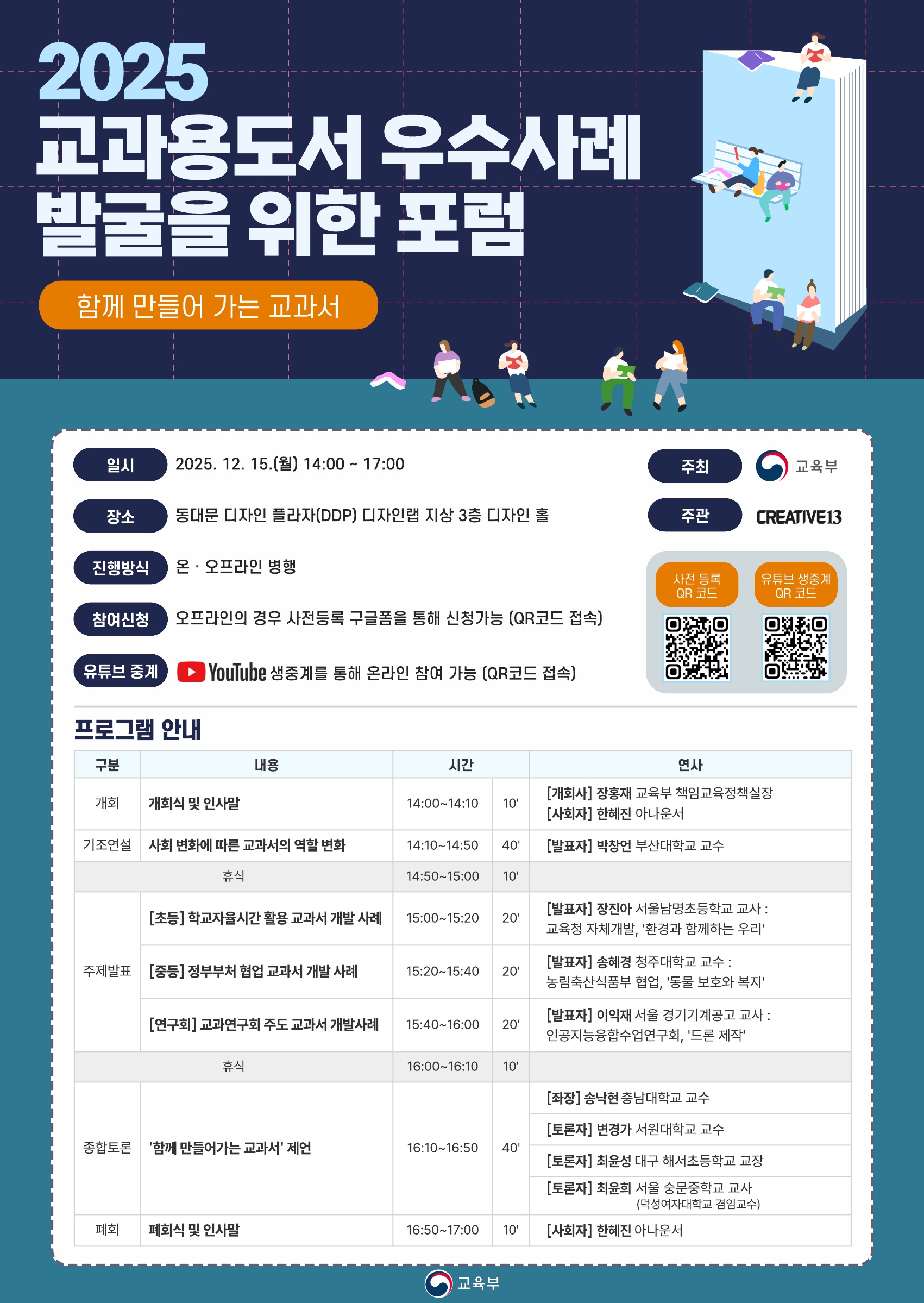 「함께 만들어 가는 교과서」를 주제로 2025년 교과서 포럼을 다음과 같이 개최하오니, '교사, 학생, 교과서 관련 업무 담당자, 전문가' 등 관심 있는 분들의 적극 참여 바랍니다.