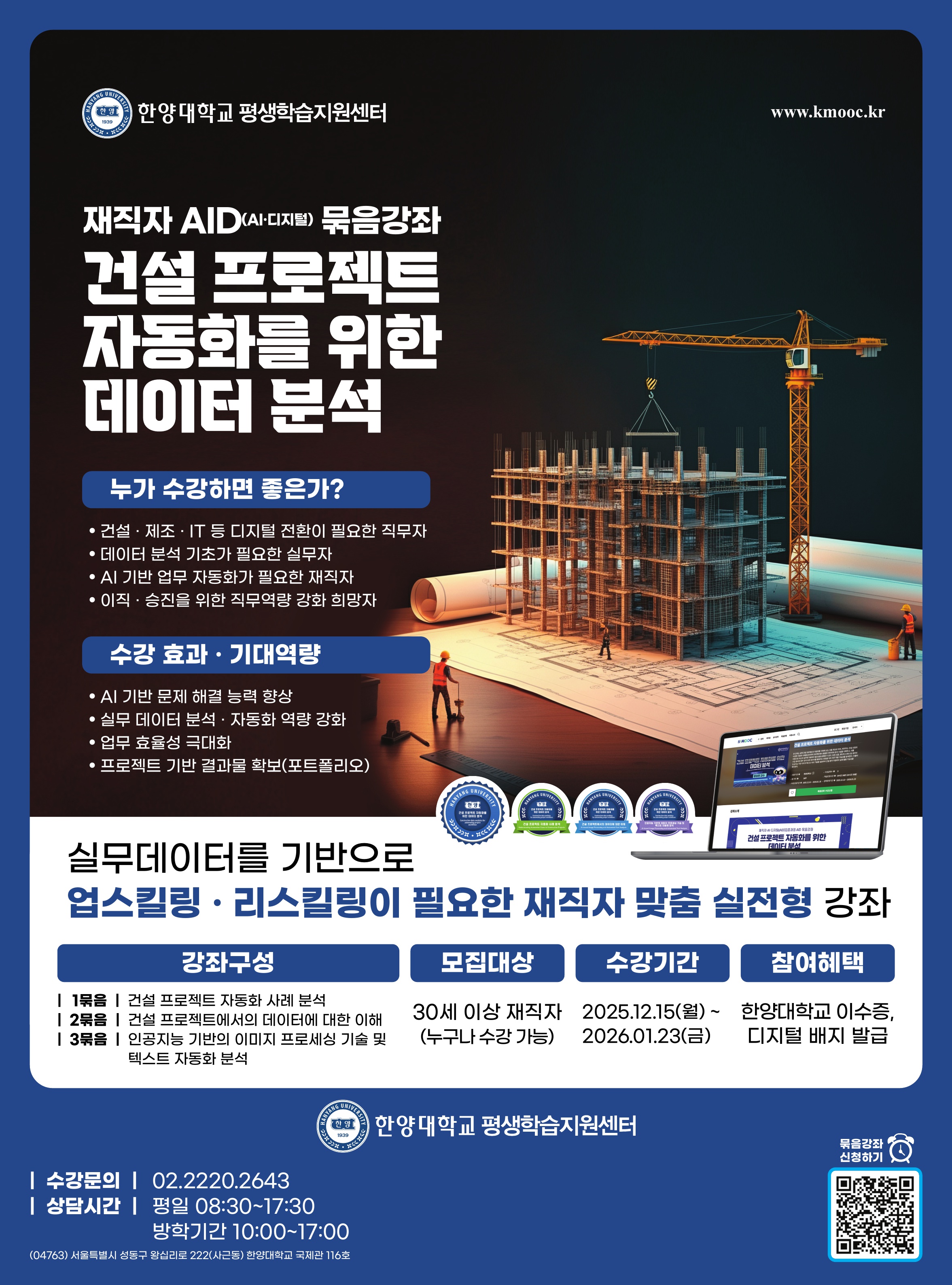 한양대학교에서는 2025년 재직자 AI·디지털(AID)집중과정 AID묶음강좌를 아래와 같이 운영하고자 하오니 많은 관심 바랍니다.