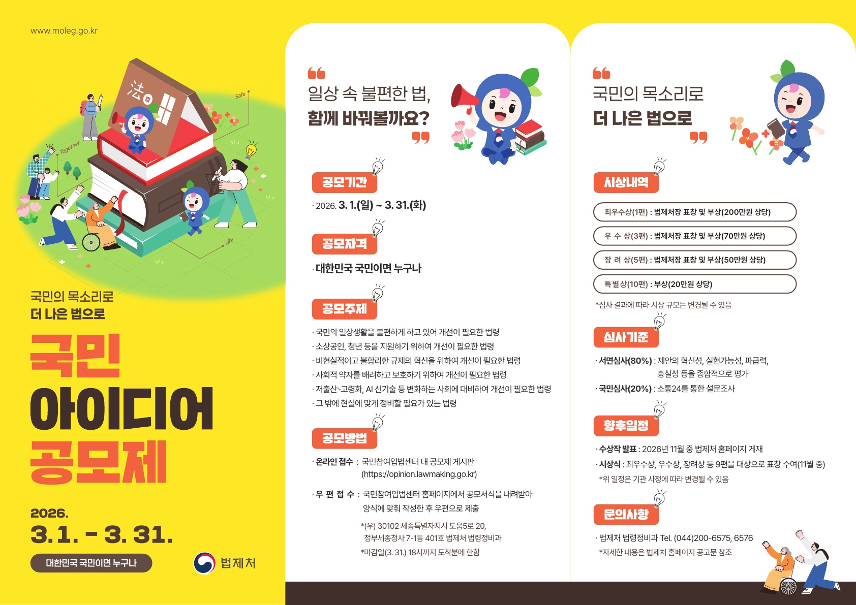 | 제목 | [학생참여] 2026년 법제처 국민 아이디어 공모제 개최 안내 | ||||