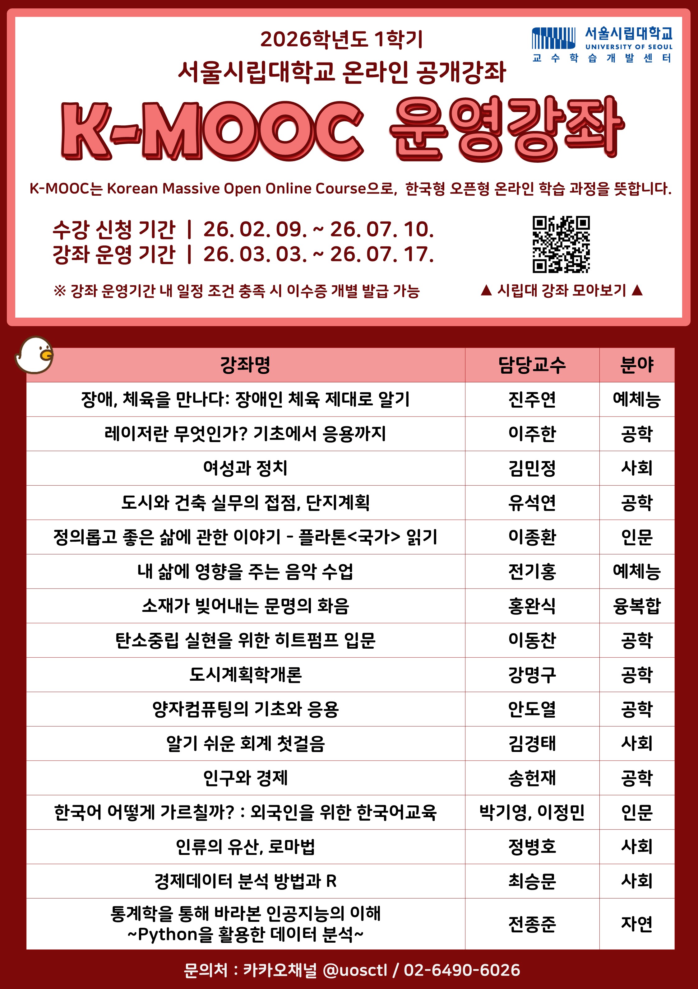 [학생참여] 서울시립대학교 2026학년도 1학기 K-MOOC 운영강좌 수강 안내