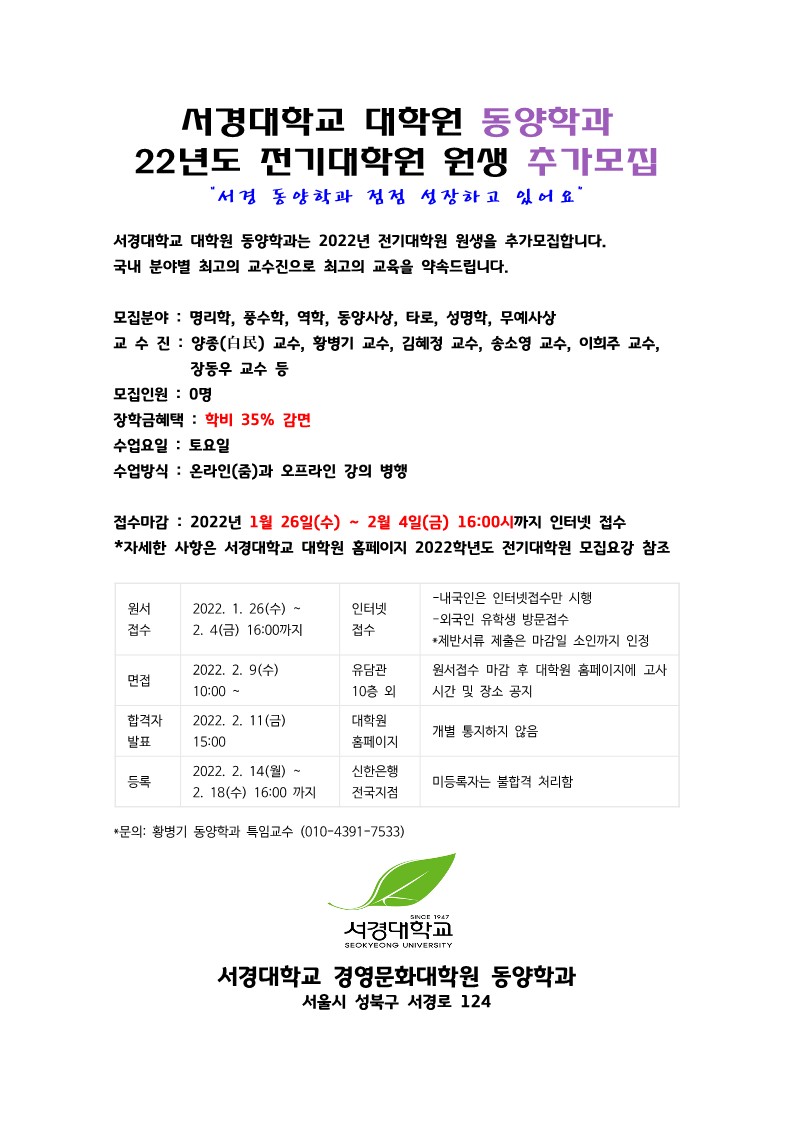 서경대학교 대학원 동양학과 원생 2차 추가모집(2022.0126)