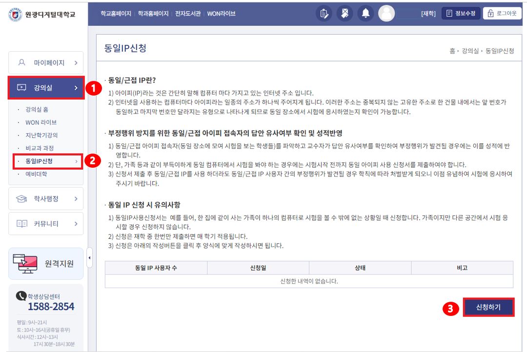 2) 동일IP 신청은 재학 중 한번만 제출하면 매학기 적용됩니다.