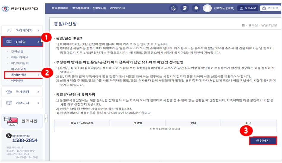가. 동일/근접IP 란 1) 아이피(IP)라는 것은 간단히 말해 컴퓨터 마다 가지고 있는 인터넷 주소 입니다. 2) 인터넷을 사용하는 컴퓨터마다 아이피라는 일종의 주소가 하나씩 주어지게 됩니다. 이러한 주소는 중복되지 않는 고유한 주소로 한 건물 내에서는 앞 번호가 동일하고 마지막 번호만 달라지는 유형으로 나타나게 되므로 동일 장소에서 시험에 응시하였는지 확인이 가능합니다. 나. 부정행위 방지를 위한 동일/근접 아이피 접속자의 답안 유사여부 확인 및 성적반영 1) 동일/근접 아이피 접속자(동일 장소에 모여 시험을 보는 학생들)를 파악하고 교수자가 답안 유사여부를 확인하여 부정행위가 발견될 경우에는 이를 성적에 반영합니다. 2) 단, 가족 등과 같이 부득이하게 동일 컴퓨터에서 시험을 봐야 하는 경우에는 시험시작 전 까지 동일 아이피 사용 신청서를 제출하여야 합니다. 3) 신청서 제출 후 동일/근접 IP를 사용 하더라도 동일/근접 IP 사용자 간의 부정행위가 발견될 경우 학칙에 따라 처벌받게 되오니 이점 유념하여 시험에 응시하여 주시기 바랍니다. 다. 동일IP신청 시 유의사항 1) 동일IP사용신청서는 예를 들어, 한 집에 같이 사는 가족이 하나의 컴퓨터로 시험을 볼 수 밖에 없는 상황일 때 신청합니다. 가족 또는 친척이지만 다른 공간에서 시험응시할 경우 신청하지 않습니다. 2) 동일IP 신청은 재학 중 한번만 제출하면 매학기 적용됩니다. 3) 동일IP 신청은 아래와 같은 경로로 신청해주시면 됩니다. 4) 동일IP 신청은 각각 신청하는 것이 아니라 동일IP를 사용하는 대표 학우님이 함께 시험을 응시하는 학우님의 정보를 함께 입력하면 됩니다. 라. 동일IP신청서 제출방법