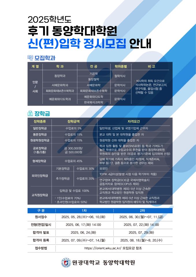 [대학원] 2025학년도 원광대학교 후기 동양학대학원 신(편)입학 정시모집 안내