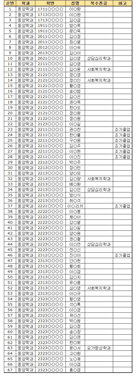 ※ 개인정보 보호 강화로 학번 및 이름은 마스킹처리 되었으며 졸업확정자에게는 개별 문자발송 예정입니다. 4. 후기 졸업식 미 시행에 따른 안내사항 가. 행사만 없을 뿐 학위를 취득하는 것입니다. 나. 학위증은 1회만 발급되며 이후 재발급 시 비용이 부과됩니다. 다. 졸업증명서는 8월 16일(토)부터 발급 가능합니다. 라. 통합졸업식 일시 : 2026년 2월 21일(토)