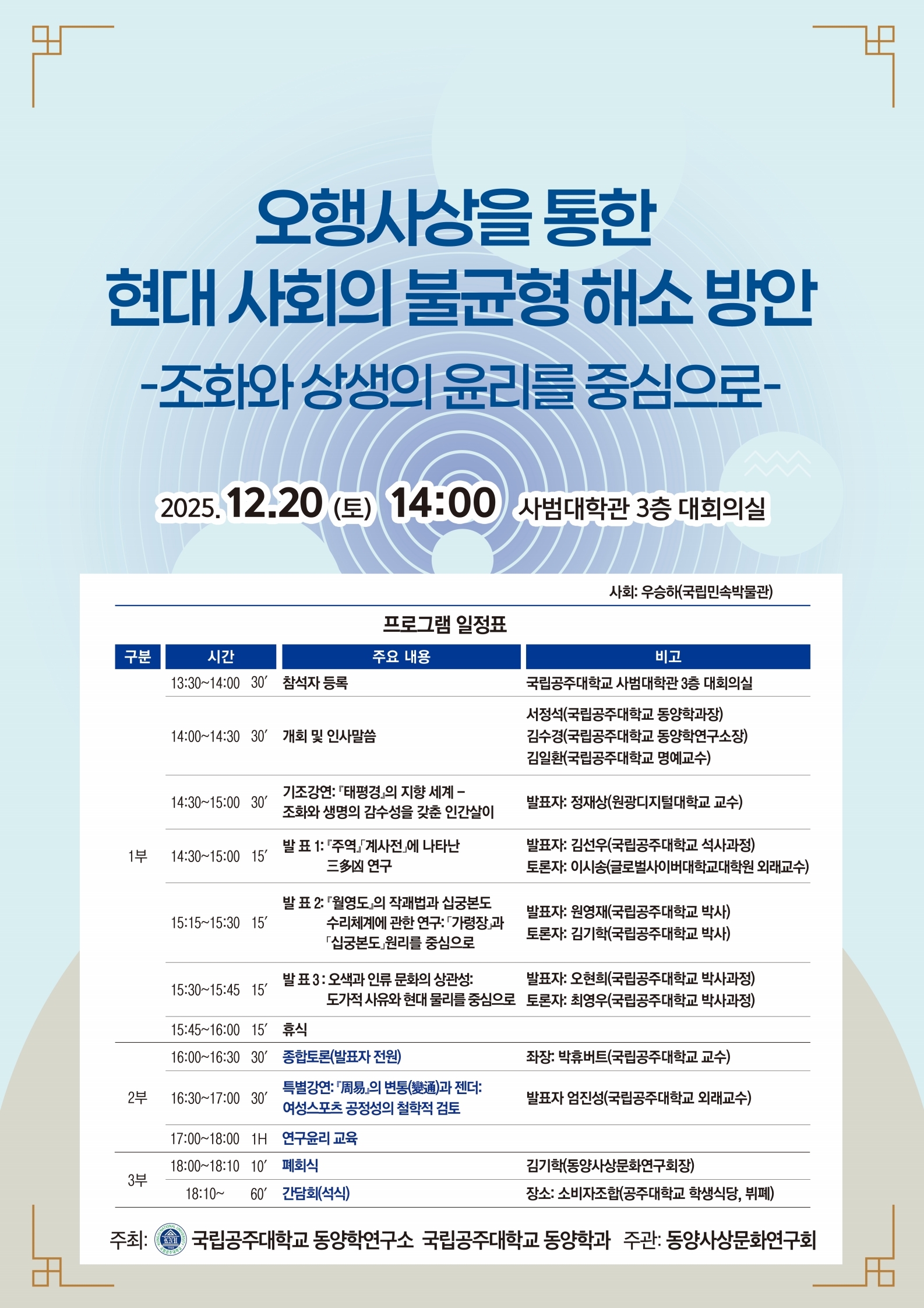 오행사상을 통한 현대 사회의 불균형 해소 방안 -조화와 상생의 윤리를 중심으로- ㅁ 일시 : 2025년 12월 20일(토) 14:00 ㅁ 장소 : 국립공주대학교 사범대학관 3층 대회의실