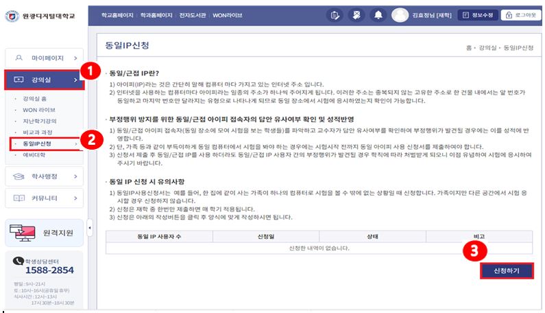 2. 동일IP사용 신청 가. 동일/근접IP 란 1) 아이피(IP)라는 것은 간단히 말해 컴퓨터 마다 가지고 있는 인터넷 주소 입니다. 2) 인터넷을 사용하는 컴퓨터마다 아이피라는 일종의 주소가 하나씩 주어지게 됩니다. 이러한 주소는 중복되지 않는 고유한 주소로 한 건물 내에서는 앞 번호가 동일하고 마지막 번호만 달라지는 유형으로 나타나게 되므로 동일 장소에서 시험에 응시하였는지 확인이 가능합니다. 나. 부정행위 방지를 위한 동일/근접 아이피 접속자의 답안 유사여부 확인 및 성적반영 1) 동일/근접 아이피 접속자(동일 장소에 모여 시험을 보는 학생들)를 파악하고 교수자가 답안 유사여부를 확인하여 부정행위가 발견될 경우에는 이를 성적에 반영합니다. 2) 단, 가족 등과 같이 부득이하게 동일 컴퓨터에서 시험을 봐야 하는 경우에는 시험시작 전 까지 동일 아이피 사용 신청서를 제출하여야 합니다. 3) 신청서 제출 후 동일/근접 IP를 사용 하더라도 동일/근접 IP 사용자 간의 부정행위가 발견될 경우 학칙에 따라 처벌받게 되오니 이점 유념하여 시험에 응시하여 주시기 바랍니다. 다. 동일IP신청 시 유의사항 1) 동일IP사용신청서는 예를 들어, 한 집에 같이 사는 가족이 하나의 컴퓨터로 시험을 볼 수 밖에 없는 상황일 때 신청합니다. 가족 또는 친척이지만 다른 공간에서 시험응시할 경우 신청하지 않습니다. 2) 동일IP 신청은 재학 중 한번만 제출하면 매학기 적용됩니다. 3) 동일IP 신청은 아래와 같은 경로로 신청해주시면 됩니다. 4) 동일IP 신청은 각각 신청하는 것이 아니라 동일IP를 사용하는 대표 학우님이 함께 시험을 응시하는 학우님의 정보를 함께 입력하면 됩니다. 라. 동일IP신청서 제출방법