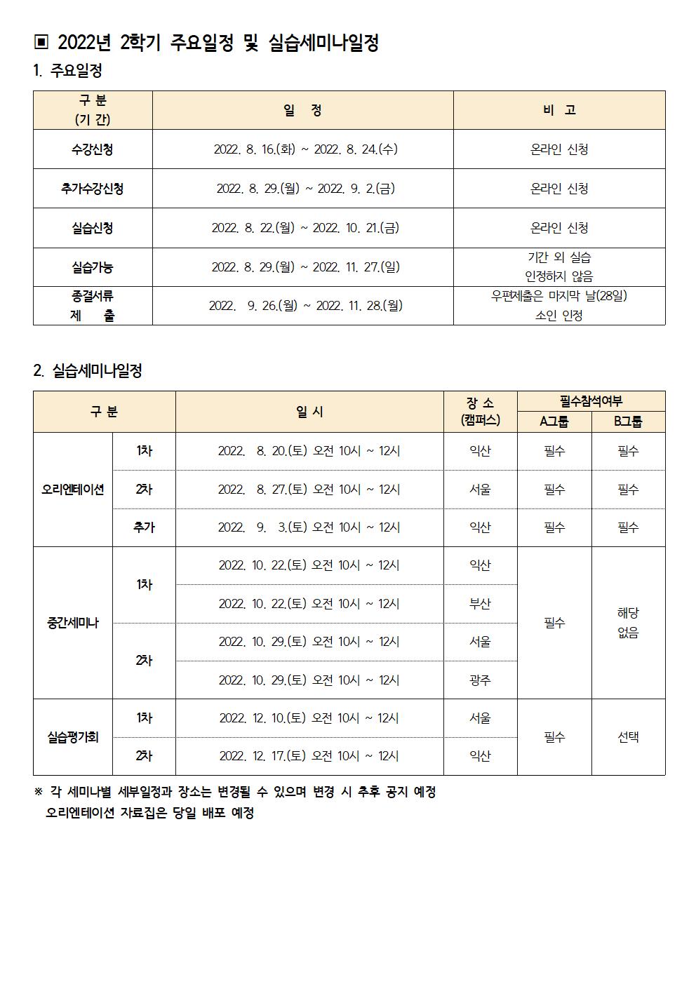| 제목 | 2022-2 사회복지현장실습 및 선실습 실습세미나(오리엔테이션) 참가신청 및 실습일정안내 | 등록일 | 2022-07-11 | 조회수 | 392 |