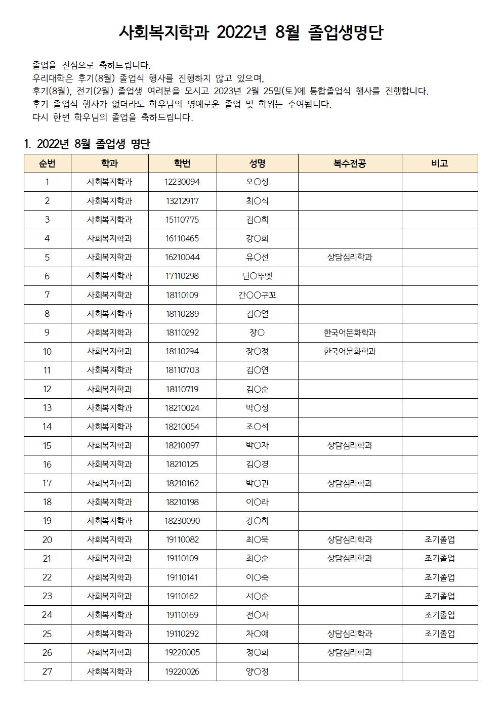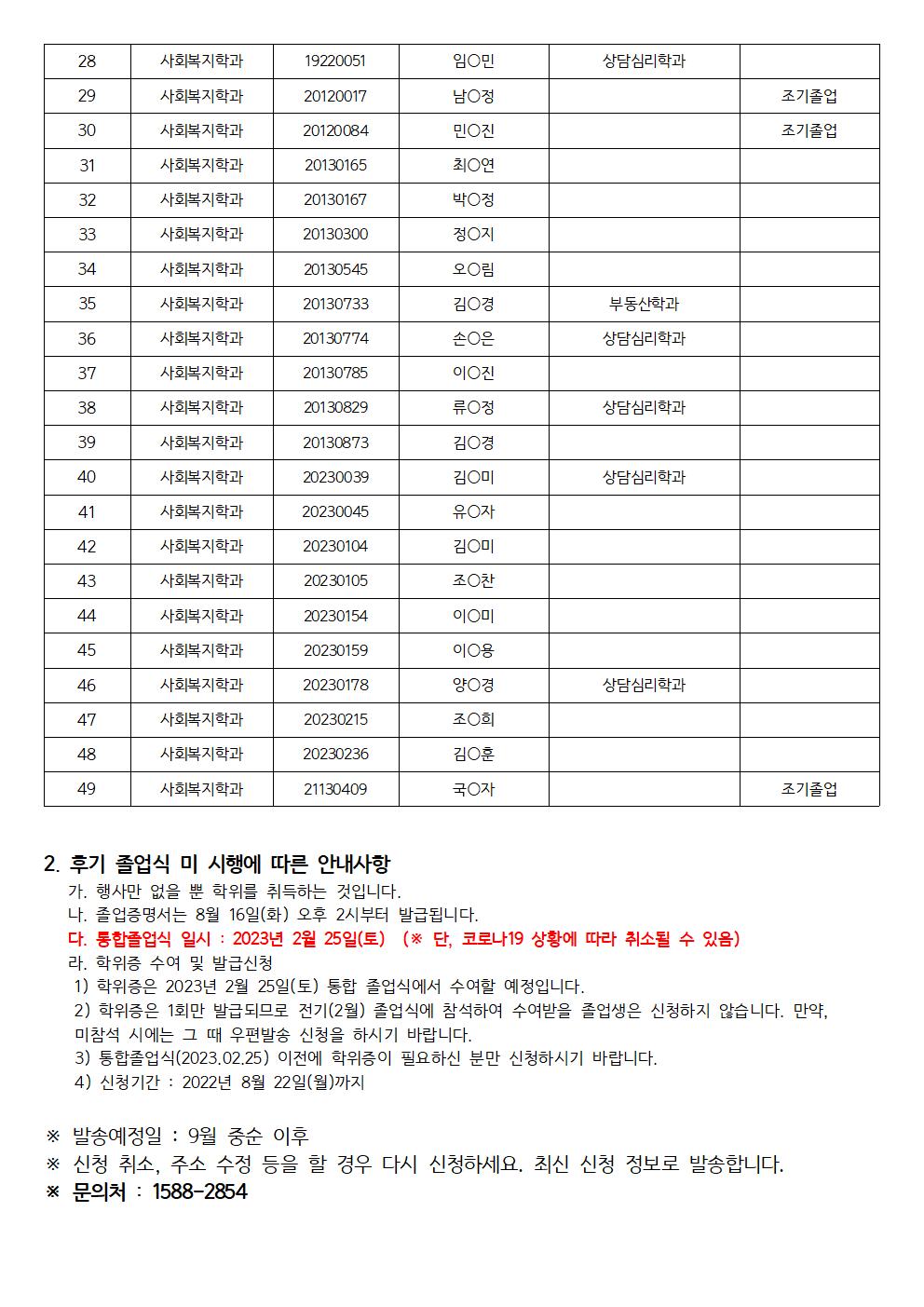 22년 8월 졸업생명단 공지