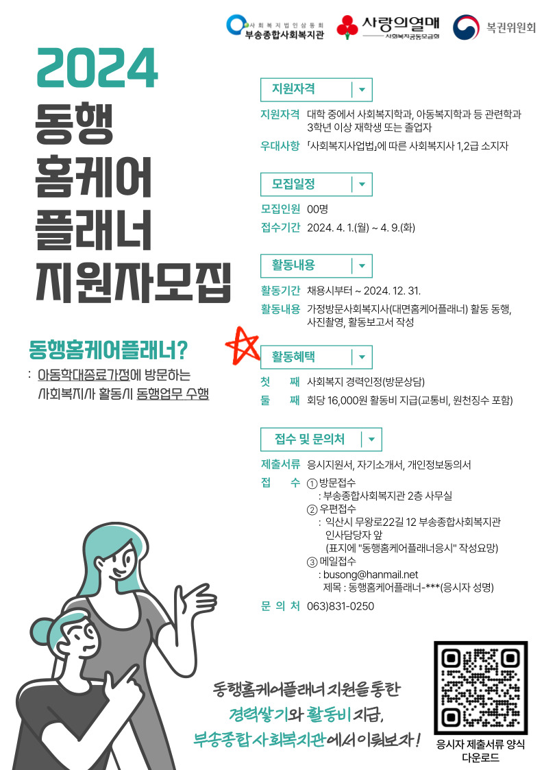 | 제목 | 부송종합사회복지관 동행홈케어플래너 지원자모집(~4/9) | 등록일 | 2024-04-03 | 조회수 | 153 |