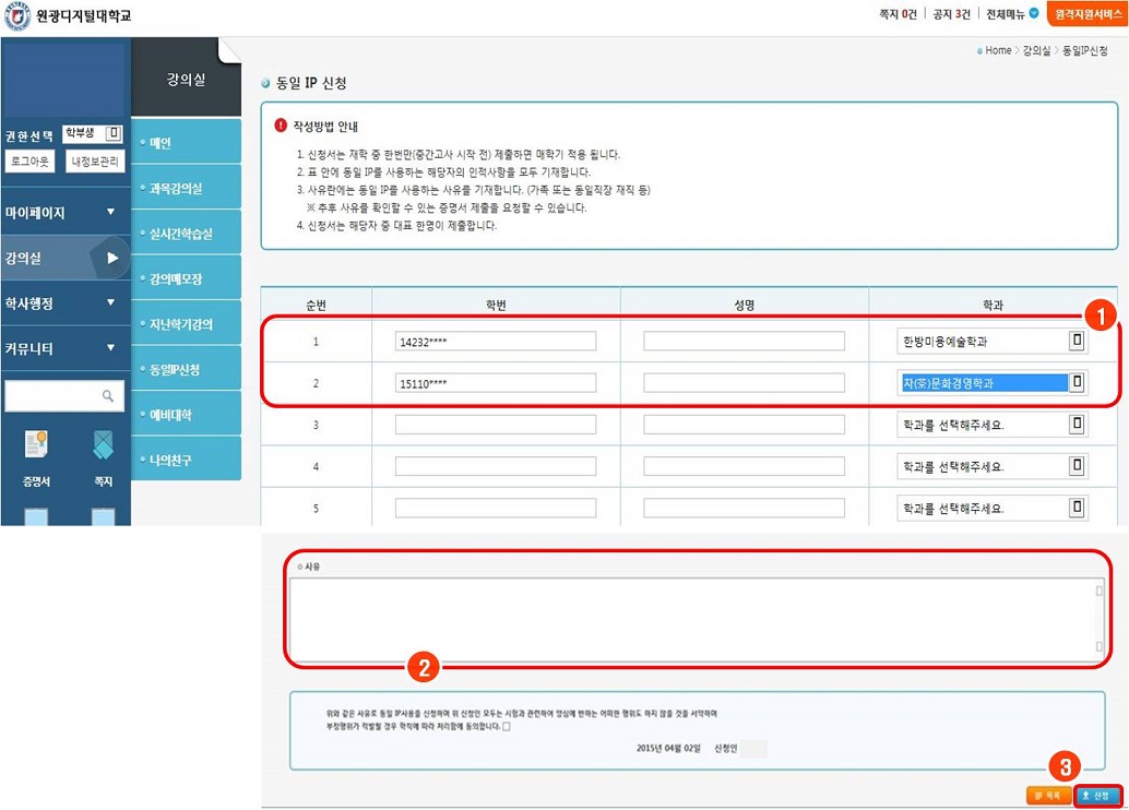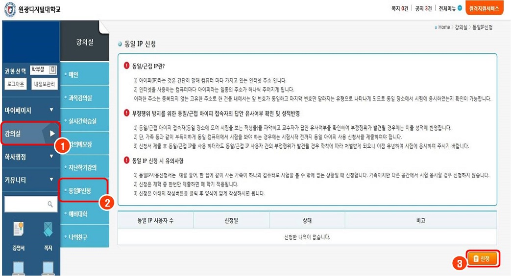 나. 부정행위 방지를 위한 동일/근접 아이피 접속자의 답안 유사여부 확인 및 성적반영 1) 동일/근접 아이피 접속자(동일 장소에 모여 시험을 보는 학생들)를 파악하고 교수자가 답안 유사여부를 확인하여 부정행위가 발견될 경우에는 이를 성적에 반영합니다. 2) 단, 가족 등과 같이 부득이하게 동일 컴퓨터에서 시험을 봐야 하는 경우에는 시험시작 전까지 동일 아이피 사용 신청서를 제출하여야 합니다. 3) 신청서 제출 후 동일/근접 IP를 사용 하더라도 동일/근접 IP 사용자 간의 부정행위가 발견될 경우 학칙에 따라 처벌받게 되오니 이점 유념하여 시험에 응시하여 주시기 바랍니다. 다. 동일IP신청 시 유의사항 1) 동일IP사용신청은 예를 들어, 한 집에 같이 사는 가족이 하나의 컴퓨터로 시험을 볼 수 밖에 없는 상황일 때 신청합니다. 가족이지만 다른 공간에서 시험응시할 경우 신청하지 않습니다. 2) 동일IP사용신청은 재학 중 한번만 제출하면 매학기 적용됩니다. 3) 동일IP사용신청은 아래와 같은 경로로 신청해주시면 됩니다. 4) 동일IP 신청은 각각 신청하는 것이 아니라 동일IP를 사용하는 대표 학우님이 함께 시험을 응시하는 학우님의 정보를 함께 입력하면 됩니다. 라. 동일IP신청서 제출방법