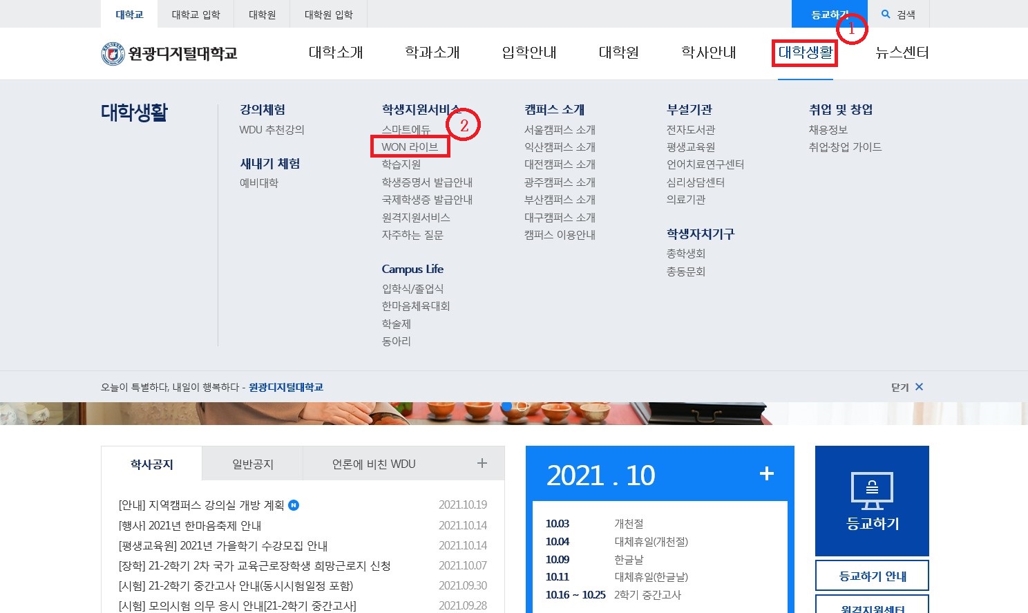 공개강의 접속 경로 안내 (시스코 웹엑스 프로그램이 설치되어 있다는 가정하에 작성하였습니다. 설치를 안하신 분들은 첨부파일을 보시고 설치하시기 바랍니다.) 1. 대학교 메인 홈페이지 접속 후 '대학생활' 메뉴에서 학생지원서비스의 'WON라이브'메뉴를 클릭 (로그인(등교하기) 하시면 안됩니다.!!)