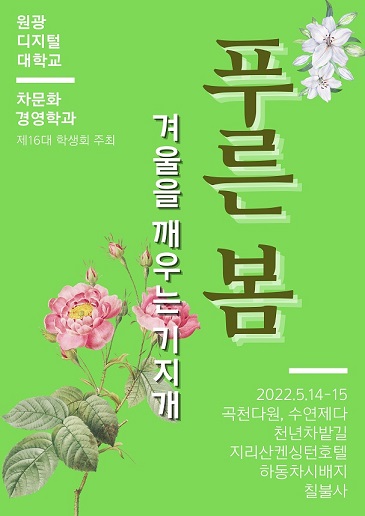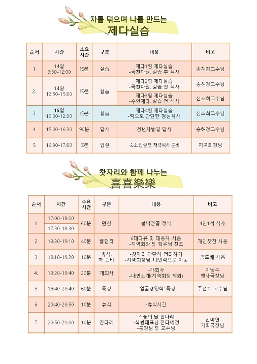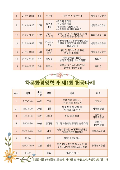 오는 5월 14,15 양일간 경남 하동에서 차문화경영학과 학생회가 주최하는 차문화경영학과 제다실습 및 MT, 답사가 진행됩니다. 3월 말부터 참가신청을 받은 본 행사는 학우님들의 열의로 4월 초에 모집이 조기 마감되었습니다. 일정은 다음과 같으며 행사가 원활하게 진행되도록 힘써주신 교수님들과 학생회 분들께 감사 말씀을 드립니다.