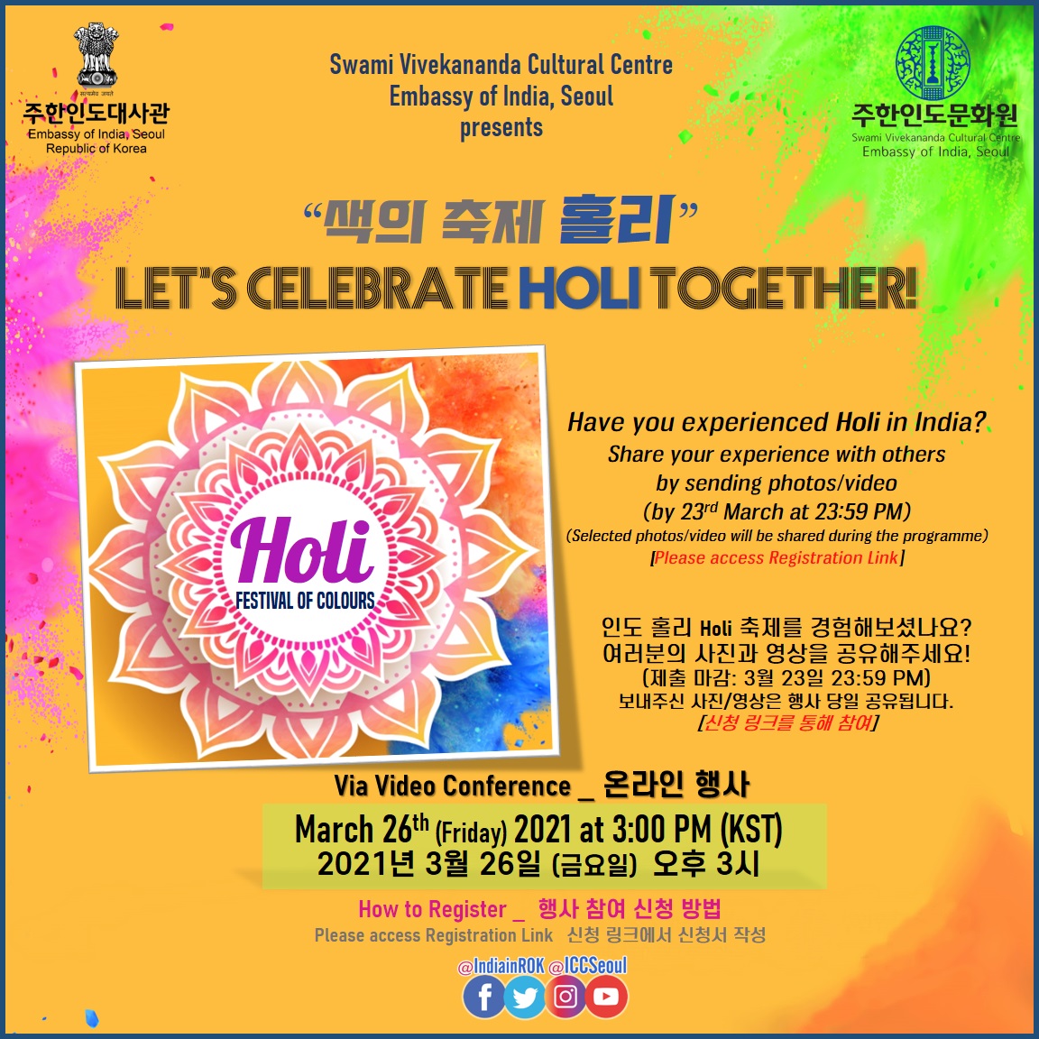 ★ If you have any photos/video related to Holi festival, please register first and share with us by sending photos/video (with brief description) to edu.iccseoul@gmail.com (Deadline for submission: March 23, 2021 at 23:59 hrs KST) * Selected photos/video will be shared during the programme via video conference. Thank you.