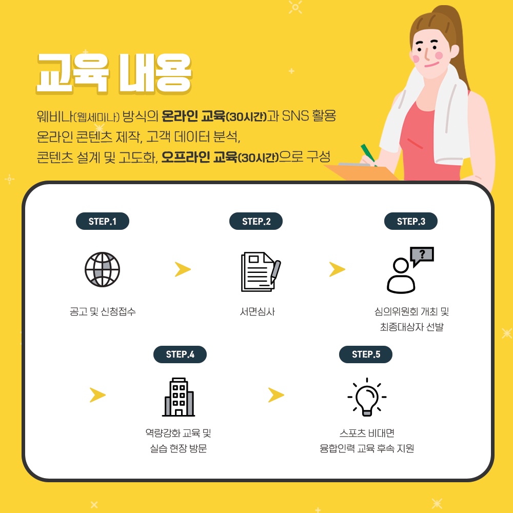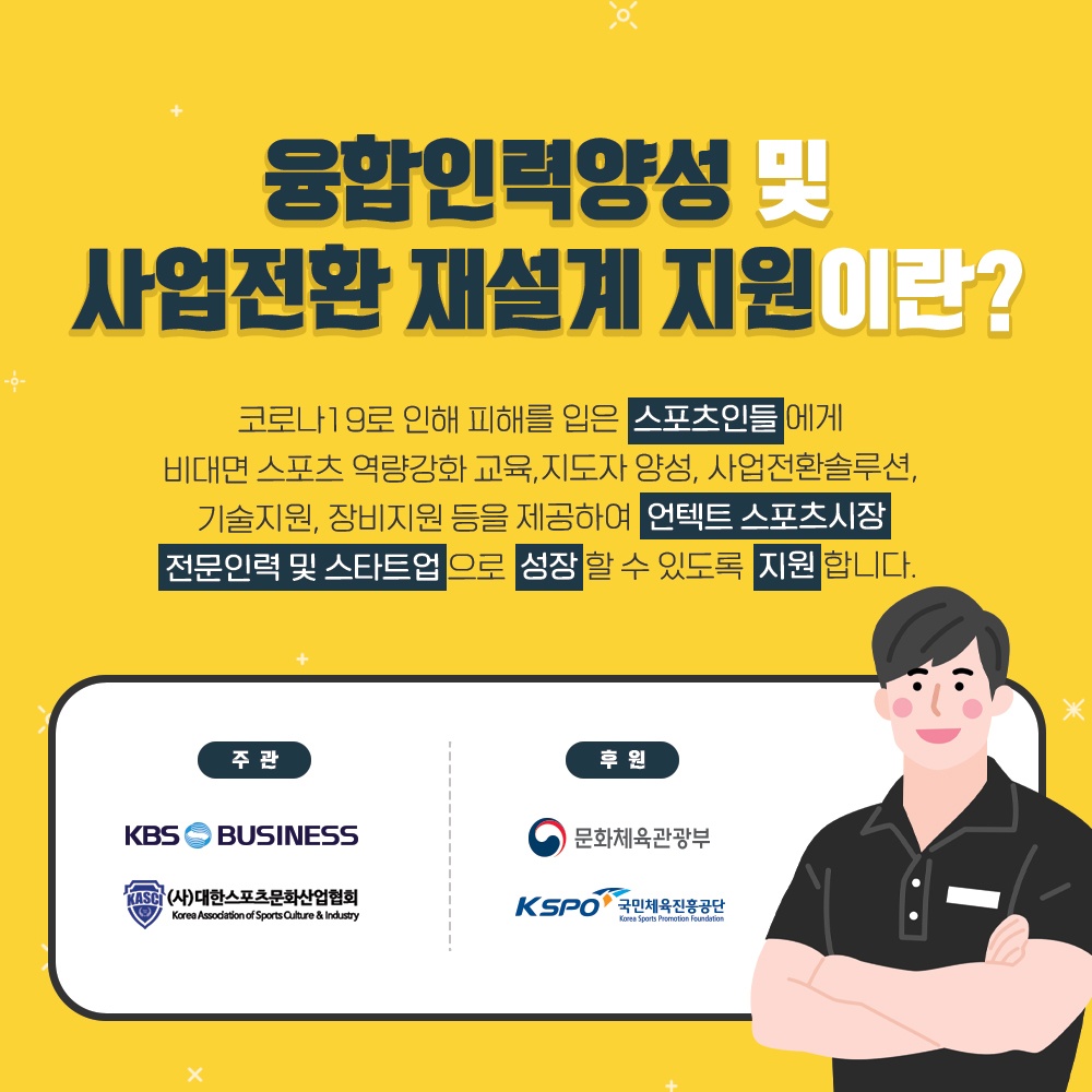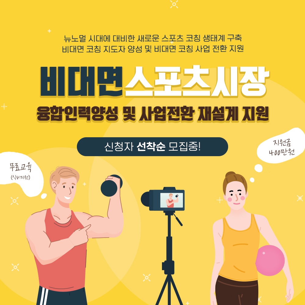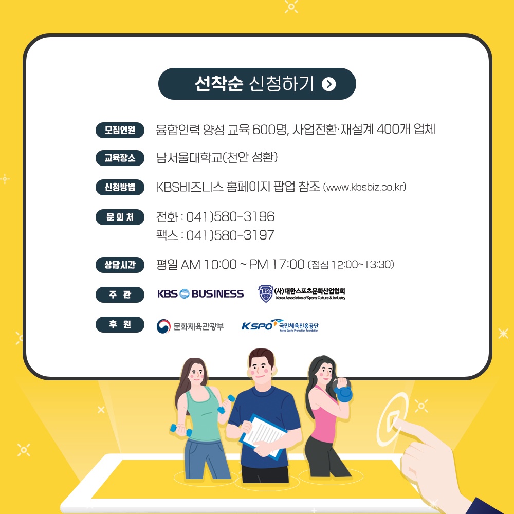 국민체육진흥공단에서 좋은 지원 사업이 있어 체육관련 학생들에게 공지드립니다. 온라인 스포츠 코칭 융합인력 양성 사업으로 현직 스포츠지도자나 시설업 운영자 분들에게 무료 교육을 제공해 주는 사업입니다. 종목에 관계없이 민간, 국가자격증 등이 있으면 되며 만약 없더라도 예비 지도자나 창업을 염두해 두고 있다면 가능할 것 같습니다. 아래 링크는 지원서 접수 홈페이지입니다. http://kbssa.kr/gn/bbs/board.php?bo_table=notice&wr_id=67 관련 영상과 팸플렛 그리고 지원 홈페이지 등 확인 하세요.