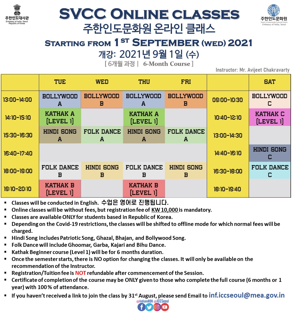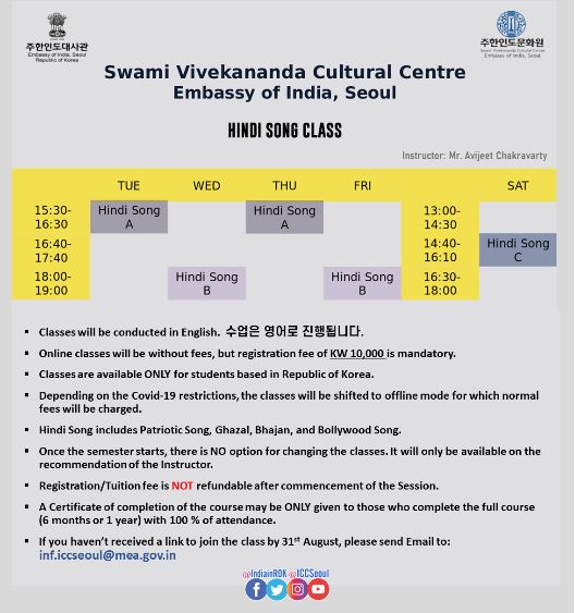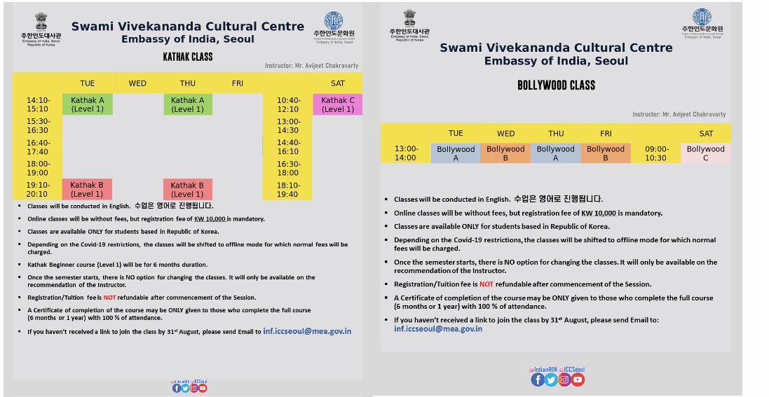안녕하세요 여러분, 주한인도문화원입니다. 주한인도문화원 온라인 클래스 새 학기가 2021년 9월 1일 (수요일) 개강합니다. (6개월 과정) *개설 과목: 까탁 / 발리우드 댄스 / 인도 포크 댄스 / 힌디 노래 온라인 클래스는 각 수업 당 신청비 1만원이며, 수업료는 무료로 진행됩니다. (이후 정규 오프라인 수업으로 전환될 시 정규 수업료를 받습니다.) (온라인 클래스는 영어로 진행됩니다.)