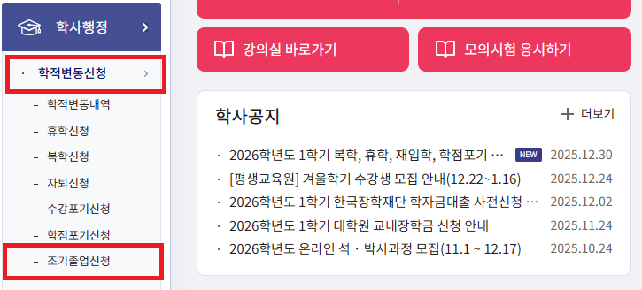 가. 경로: 등교하기→학사행정→학적변동신청→조기졸업신청