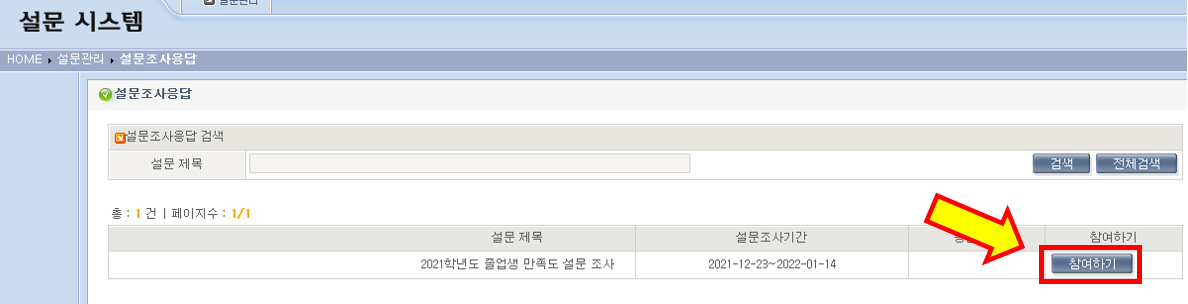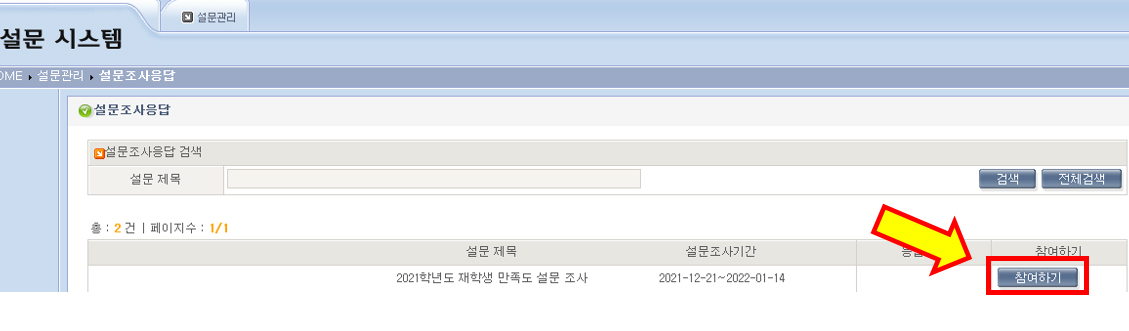 3. 설문 참여 방법 : 로그인 후 상단 중앙 첫번째 아이콘 클릭 → 설문페이지로 이동, 참여하기 클릭