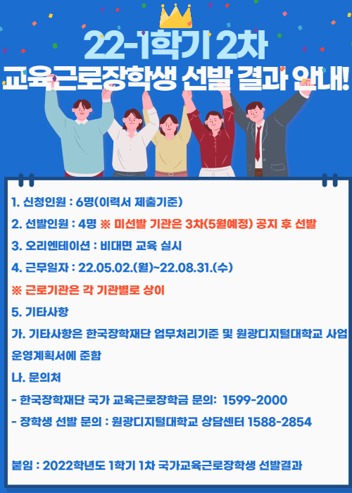 [장학] 22학년도 1학기 2차 국가 교육근로장학생 선발 결과안내
