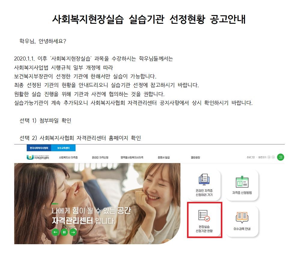 | 제목 | [안내] 22-2 사회복지현장실습 실습기관 선정현황 공고 | ||||