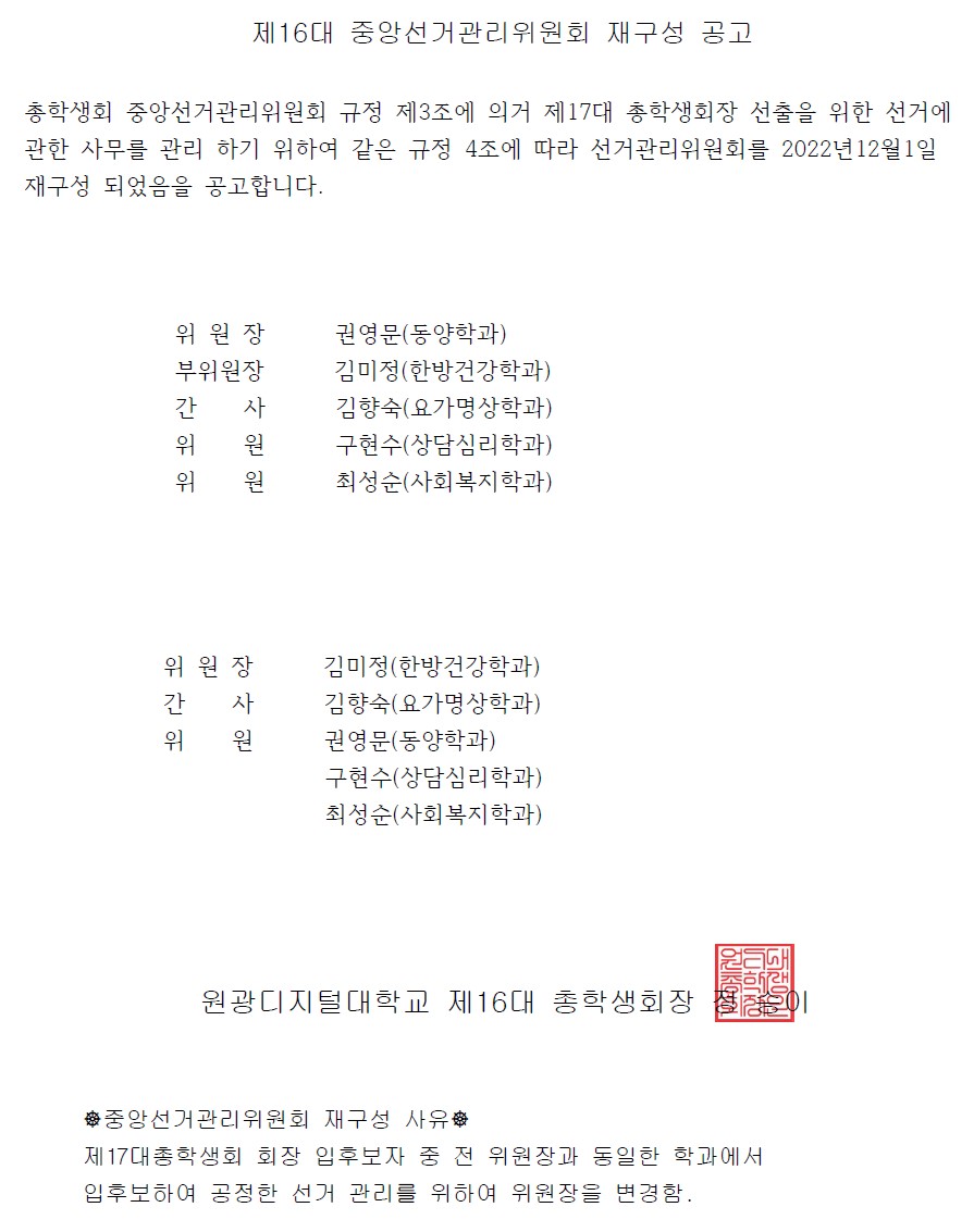 [학생회]제16대 중앙선거관리위원회 재구성 공고