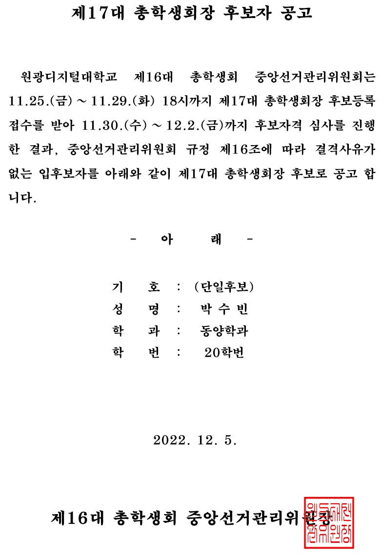 | 제목 | [총학생회]제17대 총학생회장 후보자 공고 | ||||