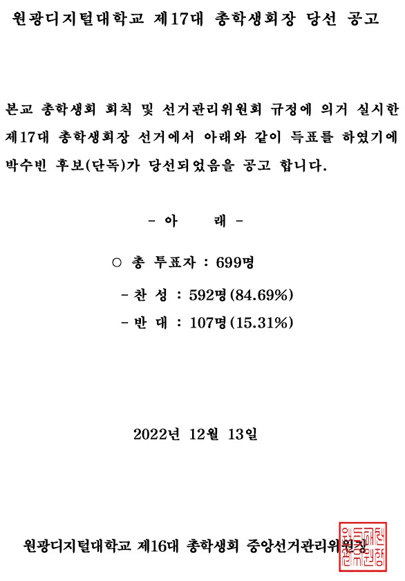 [학생회]원광디지털대학교 제17대 총학생회장 당선 공고