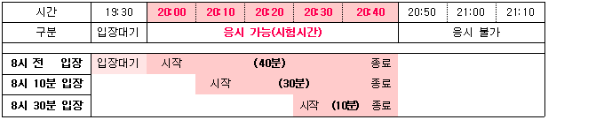 ※ 아래 과목은 정해진 교시에만 응시가능하며 과목별 시험시간은 정시에 시작하여 20분부터 50분까지 다양함