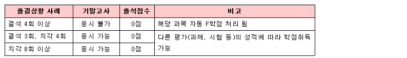 라. 결석이 4회 미만이어야 기말고사를 볼 수 있습니다. 그러므로 시험 전 수강하지 않은