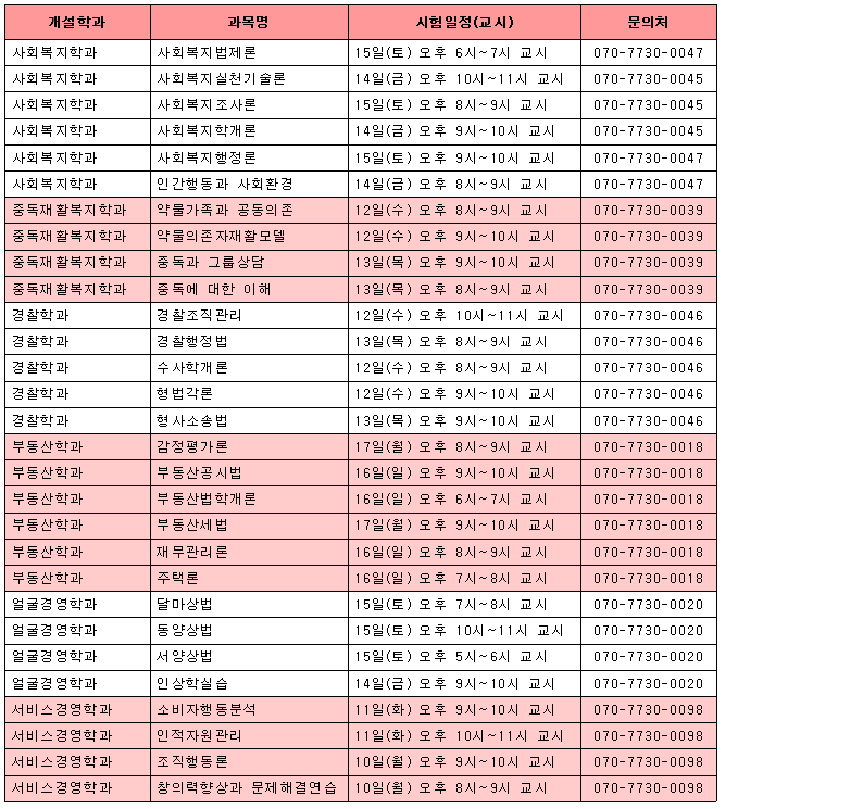 나. 과목별 시험시간 및 시험유형(시험, 과제, 수업진행)등 상세내용은 과목공지게시판에서 확인하시기 바랍니다.