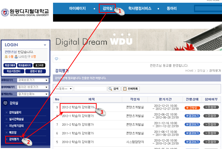 -접속방법: 로그인 후→[강의실]→왼쪽메뉴 [강의평가]→2012-2 강의평가(강의평가 제목) 클릭
