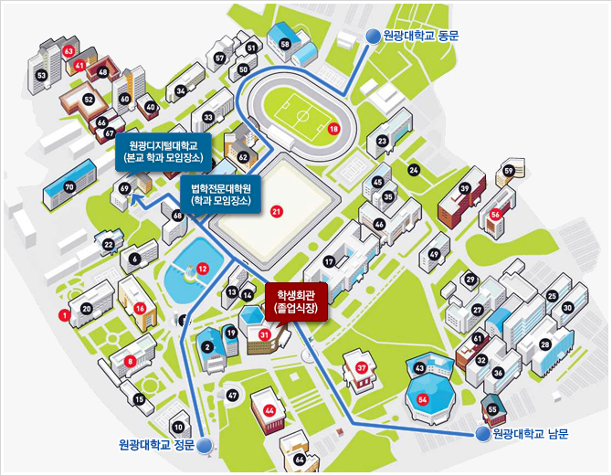 한방건강학과 | 본교 별관 3층 실습실 | 원불교학과 | 법학전문대학원 505 |