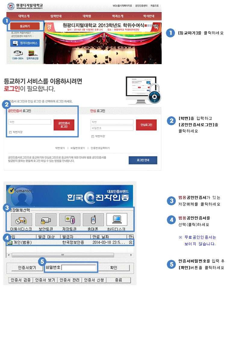 2014학년도 1학기 신·편입생은 범용공인인증서 발급 및 사용적응을 위하여 개강 전까지 안심로그인 방식과