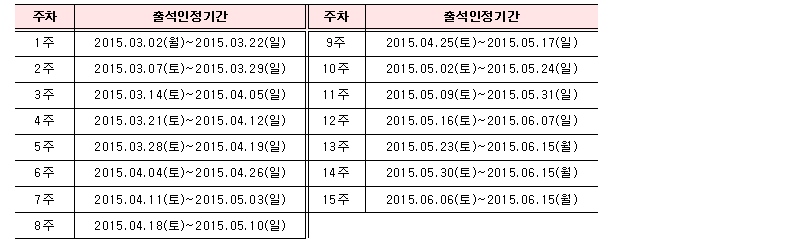 (학기종료인 15주까지만 출석인정기간이 적용되므로)