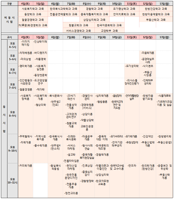 다. 과목별 시험시간 및 시험관련 상세내용은 과목공지게시판에서 꼭 확인하시기 바랍니다.