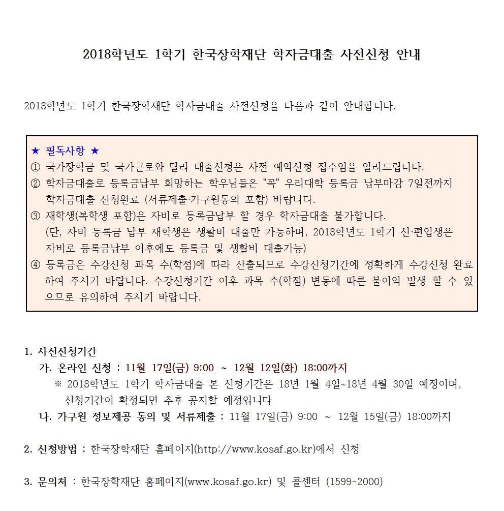 2018학년도 1학기 한국장학재단 학자금대출 사전신청 안내