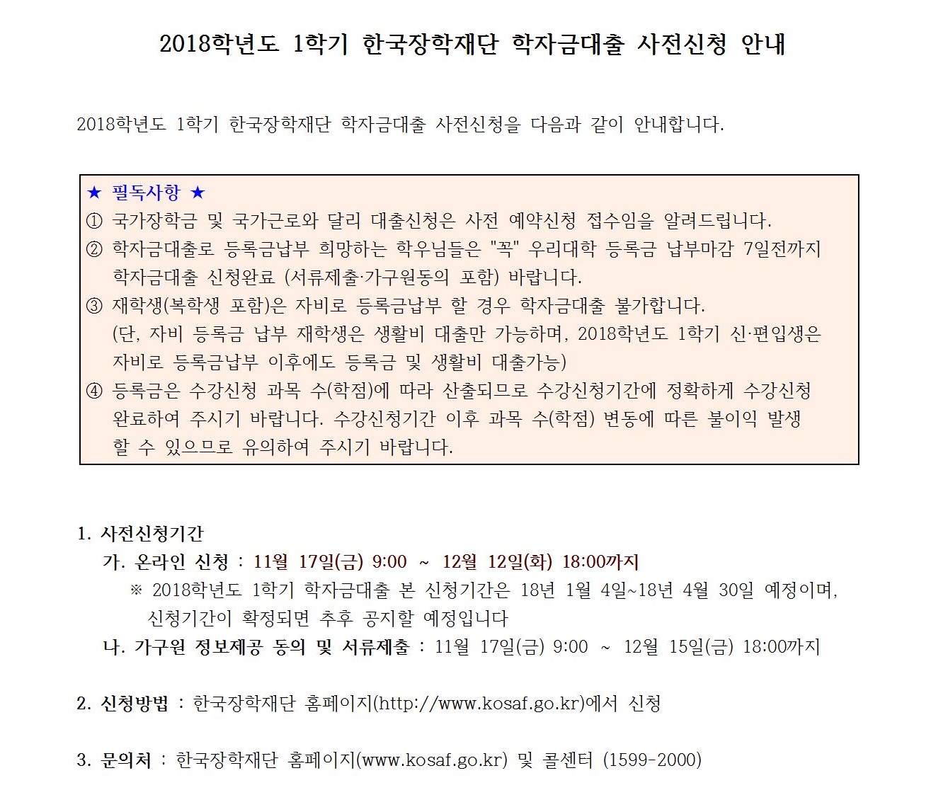 2018학년도 1학기 한국장학재단 학자금대출 사전신청 안내