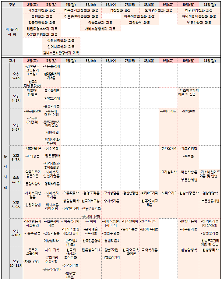 가. 동시시험은 정해진 교시에만 응시가능하며 과목별 시험시간은 20분부터 50분까지 다양합니다.