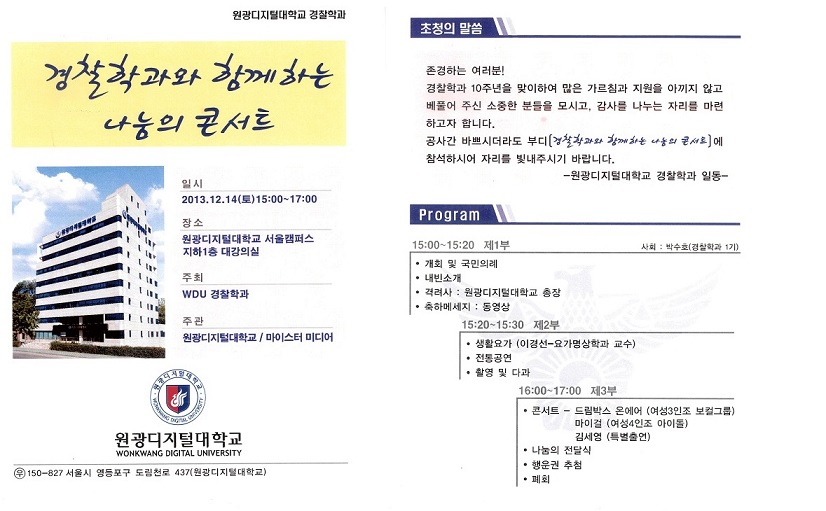 공사간 바쁘시더라도 부디 ?경찰학과와 함께하는 나눔의 콘서트?에 원광디지털대학교 재학생 여러분들의 많은 참석 바랍니다.